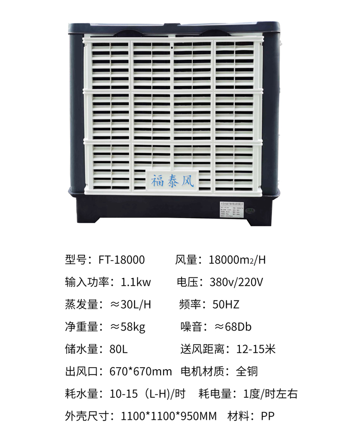 福泰環保空調性能穩定在越炎熱的天氣下降溫的效果越好。適用于開敞式及半開敞式環境,能夠直接輸送自然風及輸送降溫后的涼風。室外新鮮空氣經福泰蒸發式冷氣機過濾、降溫后向室內源源不斷的大量輸送,將室內帶有異味、粉塵和混濁悶熱的空氣排出室外,同時兼顧換氣降溫及增加空氣含氧量等多種效果。
